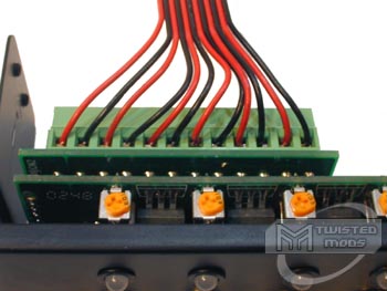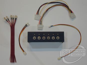 The color options with this controller are rather simple, original aluminum or a sleek black anodized aluminum faceplate. Both colors are available on AutoDeletePro, but in this review we will be taking a look at the BLACK anodized version. Upon opening the silver and black box which the controller was in, I pulled out the controller, a weird looking cable with male 3-pin connectors at one end and stripped ends at the other and a set of printed instructions. Let us first take a close look at the controller. The controller itself comes preinstalled into an aluminum faceplate. On the front of the black faceplate are six visible 3-position switches as well as six visible dual-colored LEDs. Each position on the switches control voltage output on that port differently. For example, the switch in the middle position cuts voltage output off (turning the fan off). When the switch is switched to the bottom position, the LED above that switch turns green and voltage output is set on low which starts the fans spinning slowly. When the switch is in its most upright position, the led above that switch is turned to red and voltage output is changed to 12volts which essentially powers the fan on that specified port at full RPM. One thing that I kind of laughed at when I took a look at these switches is the fact that AutoDeletePro installed the faceplate on these slightly wrong. On the fanbus, there is a washer which has a small bent-up tab which is meant to go between the faceplate and the controller instead of between the nut and the faceplate on the outside of the controller. This is nothing to get our panties up in a bunch about however, a simple fix would be unscrewing the nut screwed to each of the switches and pulling the controller off to put that washer on the INSIDE of the faceplate. Keep in mind, having it stay as AutoDeletePro has installed it does NOT affect performance of the product whatsoever. As you should know by now, any controller which is anodized is put through a little scratch test by me. I pulled out a penny, and with light pressure on the black faceplate, I was able to see a small scratch. As I applied a little more pressure, the faceplate was easily scratched. Although your baybus should not take much abuse as long as it is properly installed into the 5.25" bay, we conduct these kinds of tests to keep you aware of ALL aspects of the product. After checking out the circuitry on the rear of the controller, I wasn't able to really see anything that stood out, except the HUGE green wiring terminal located in the top left of the PCB. Keep in mind that EACH FAN consumes two holes in the wiring terminal, thus, 12 holes make the terminal quite hefty! You can forget about getting confused on installation however, because printed above each hole in the terminal is a port # (1-6) along with the wire color (black or red). Power is provided to the unit through the molex connector located on the left of the PCB. The last thing which I noticed on this controller is that above each switch, located on the TOP of the controller are yellow voltage regulators for the controller's SLOW setting. By default, this controller outputs around 7volts of electricity, but if you plan to run higher rpm fans like Sunon and Vantec Tornados, you will require at least 9volts of electricity before the fan even starts to spin. For this reason, Noise Isolator has placed these yellow "pots" on the top of each port to allow you to control how much voltage is being output on the low setting, between 7volts and 9volts. If your fans already spin on the default pot setting, you may opt to leave it where it is or spin the fans up a bit more to get a couple extra RPM on low setting.