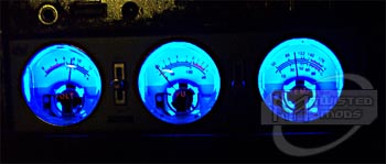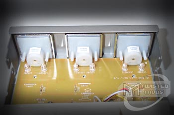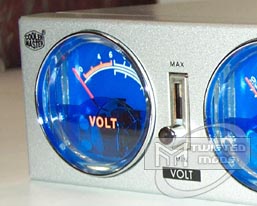I?m assuming that Cooler Master?s thinking here was to give us a device with a size and shape that is familiar to us, when they could have easily halved the size of the Musketeer. If weight is an issue, say for a portable system for LAN gaming, I don?t see a problem with removing the lid of the housing, thus shaving off quite a few ounces of steel. I removed the three screws on a white plastic housing that holds the two sliders and acts as a light reflector for the six white LED?s mounted behind each indicator. The indicators themselves are sealed units, and swapping the LEDs out would have no effect on the indicators since they rely on a blue plastic fascia behind the needles for the color. I like the fact that you can see not only the needle, but also the actuator mechanism through the clear bezels.