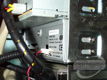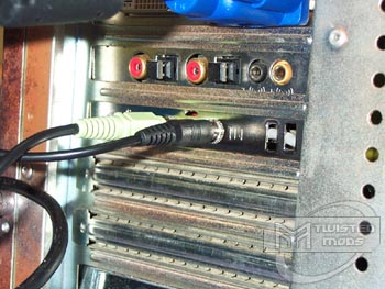 After the temp probe was plugged into the back of the unit, I installed the audio PCI bracket on the rear panel. I couldn?t resist sleeving the ugly gray audio cable with some ? black split-loom sealed on each end with shrink tubing. The cable was then jacked into the female port on the back of the Musketeer.