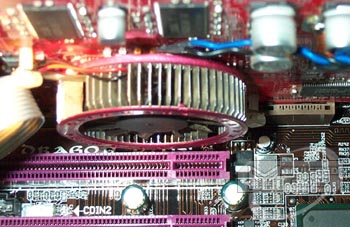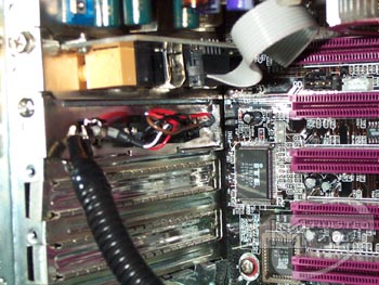 First, I had to determine which fan I wanted to control via the slider. I was a hesitant to connect an unproven voltage controller to anything critical like a CPU fan, so I chose the lighted 80mm intake fan in the Biohazard case. Next, I installed the temperature probe on the underside of the GPU heat sink on my Gainward GeForceTi 4600. I had to remove the heat sink, of course, but it was a good opportunity to get some quality Arctic Silver compound on there, and give the fan a good dusting. Not included in the packaging was the small strip of strong cellophane tape used for attaching temp probes, so I used black electrician?s tape. It?s important to use very sticky tape to secure temp probes, because just a few wiggles of the wire lead and they will slip out of the tape.