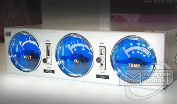 This retro-styled 5-1/4 inch bay mounted display device came packaged in a sturdy and Earth-friendly recyclable box, and thankfully not one of those impossible-to-open-without-a-chainsaw vacuum formed plastic packages. The first impression out of the box was its weight; something I would more expect from an older CD-ROM drive. The Musketeer?s two sliders and three blue-colored analog indicators are capable of displaying and adjusting fan voltage, displaying sound pressure (audio intensity), adjusting its own sound sensitivity, and indicating temperature (via the included thermal sensor) in both Celsius and degrees Fahrenheit. From the looks of the Musketeer, available in silver or charcoal black finishes, I can see this unit at home in a variety of cases from retro-industrial styled to modern home theater PC?s.