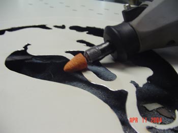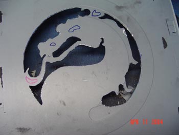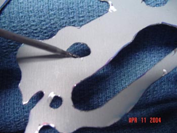 The grinding stone will be used to get rid of rough edges, detail EVERYHING, and make the cutting blade ?wiggled? curves into actual perfect curves. I?d recommend starting off with something similar to this grinding stone below (better view in materials list). Use the end (fine) of the stone to get into small areas and apply pressure to work the metal into a smooth curve. Then on the bigger curves, use the part closer to the Dremel (bigger around) to grind down the curves in great detail. You should spend more time than you think you should on this part, if you want it to look awesome when it?s done. Also, experiment with different sizes and shapes of grinding stones. Also, this is where I like to use some creativity. I made a lot of curves a tiny bit bigger, and gave a couple curves an abnormal curve, but still used detail. If you look on the nose of the dragon on the pic below, I did a lot with the bump curves on it. Look at the tongue too. On similar points, you can decide to make it a very sharp point, and use the stone to give it the shape you want. I decided to leave it kind of round, with a small, dull point on it.