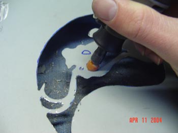 Last, I got out my new metal cutting bit and pushed it down in the center of the nostril design I had. Oddly, it gave me no hard time, and went straight through after about 4 seconds of pressure. Then I worked it to the sides and up and down to achieve the shape I wanted. I did the same with the small hole down to the left. And then, yes, I smoothened those edges out too, these holes were the last ones I did for some odd reason.