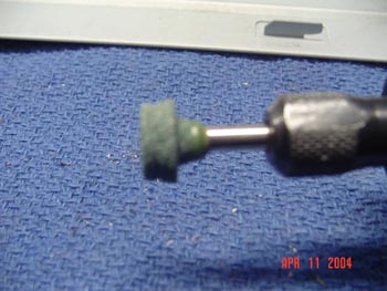 Now, take another grinding stone, tilt it as seen in the picture, and start running it along the edges of the cuts. This will de burr the edges so they will not cut you. Then run your finger along the edges slowly to see if it is still rough. If it is still jagged or rough, make a few swipes over it again to smoothen it out. Be extra careful not to slip while doing this, because the spinning factor may roll it onto the part you don?t want scratched at all.