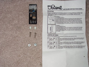 For those of you that have seen the cool pulsing power LED's on the Apple G4's and thought to yourself "I wish I could do that on my PC" your wait is over! The pulser is packaged in an anti-static bag to protect it from any damage. Included with this kit is the pulser unit, screws, nuts, plastic standoffs and of coarse instructions! The instructions included are very detailed and nicely done. They even give pointers on a couple good places to mount your pulser inside your case. I of coarse didn't choose either.