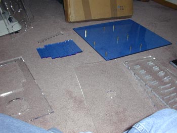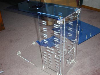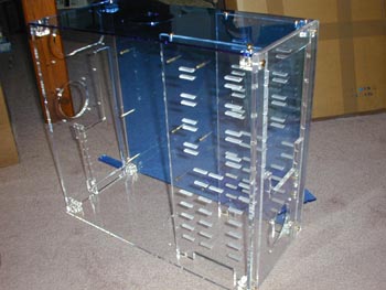 The instructions included for assembly were a bit blurry to me, so out with the instructions and in with the brain power. It took a couple minutes to figure out exactly how the case was supposed to be put together, but not a big deal. I Just unscrewed the brass screws and switched panels as needed. Before I go any further, I would like to make you aware that there were 8 acrylic cubes included which go in each corner which are used for screwing the panels into. Once again, paying attention to the finer details, these cubes are fully see through and include brass threads for the screws to grasp. I started assembling this case with the bottom panel (small centered speaker hole) and the front panel (drive cutouts, ??, beveled edges). I left all the screws loose until the entire case was assembled and then I finally went around and tightened everything. Next, I threw in the two drive racks (skinny holes all the way up) and screwed those in from the bottom panel and then placed the top panel (blue) on. Next came the rear panel (IO Holes/PCI Holes). After the main framing was finished. Then came the motherboard panel (gold leads already installed, blue) and lastly came the final side panel (two fan holes). This is where I noticed that I had been shorted by ONE screw and there were no extra screws included! Once I had everything as far as acrylic assembled, I took my screwdriver and continued to tighten all the screws until the case was sturdy. Remember not to OVERTIGHTEN the screws because the acrylic WILL Crack. I then pulled off the clear side panel and installed the front control panel (leds, power button, etc.) and attempted to install the speaker in the bottom panel but I never figured this out. In the bag with the system speaker were three screws which were too small to screw into the pre-drilled holes in the acrylic. This was the second problem I was able to spot with the case. Throwing the speaker back in the bag, I proceeded to install the drive fillers for both floppy and 5.25? bays. I pulled out the blue fillers and the bag of ?brass plugs? and installed the drive fillers. This method can cause two arguments. On one side, you could say that the plugs allow for easy access/removal of front bays, while others may argue that these plugs are a bad idea as they can cause fillers to fall out and be lost. Being lost did not seem like a problem to me, the drive fillers were so tight in there with the acrylic I had to take the back of my screwdriver and hammer the brass plugs in for the full effect. Assembly was finally complete. It took me about 45 minutes to fully assemble the case with all the appropriate tools, but that is without instructions and with my trial and error.