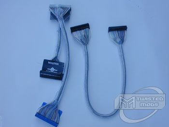After pulling these rounded cables from the packaging, I got a nice big whiff of that rank smell that all clear rounded cables have. Looking at quality, I would have to say that these are way thicker than CuttingEdgeCaseMods? solid colored rounded cables and they even included end ?boots.? Not only do rounded cables clean up a case?s appearance, but they also increase airflow. If you liked the fans on the previous page, you may want to consider a pair of these as well due to the already weak airflow. There?s not much to say about rounded cables, but the smell of these would be one reason I would not use these. Once I had installed these and the case got back up to its heated temperatures, it?s like the exhaust fans were blowing the smell right into my nose ? Disgusting! I wasn?t really expecting these rounded cables to respond much to a UV light, but surprisingly enough, they did quite well! Just like the other products, these ones did great under the light! Also, included on these cables are pull tabs to make uninstalling easier and to allow ?even? removal without bending any IDE pins on drives. An 18? IDE Cable goes for $8.99 while an 18? Floppy cable goes for about $7.49. If there?s one thing I liked about this set of cables, it was the fact that they were both silver braided and UV responsive ? the first pair like this I had seen without a greenish tint!
