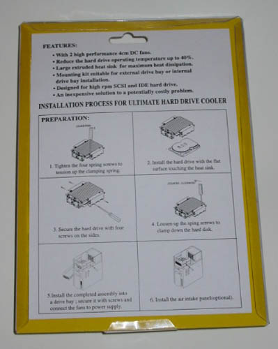 Click on pictures for larger size. ??? Pic-1: Front of the package, the clear front shows off the blue anodized heatsink. Pic-2: Back of the package, shows features and installation instructions. Features: