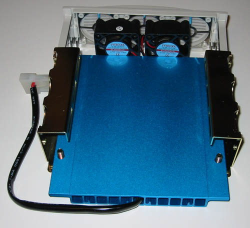 Pic-3: Contents, the hard drive cooler, with a bag of mounting screws. Pic-4:? You can see the two fans, but the front grill is meant for three fans, a third fan would have been better.? The four screws, two on each side, have springs underneath to keep pressure between the hard drive and the heat sink for better heat transfer. ?? ????? Pic-5: Underside of the cooler, pass through molex connector on the left side.? Large surface area of the heat sink makes for better cooling. Pic-6: Front grill taken off to show the two Evercool 40mm fans. The grill has an air filter behind it to catch dust and dirt before it gets inside your case. You can slide the front piece off if you ever need to clean the grill, or just don't want to have it limiting the airflow. ? Configuration used for testing: