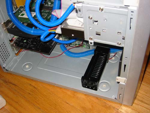 Pic-4:? The contents of the box, crossflow blower with a pass through molex connector, this isn't your normal case fan. Missing is mounting hardware and instructions, these would've been helpful. ?? ????? Pic-5: View of top and back of the crossflow blower. Pic-6: From the back of the blower you can see the 20 curved aluminum fan blades.? Each blade is 6mm wide and 9 cm long. Pic-7:?The air comes out of the lower front of the blower.? Pic-8: Here I placed the blower in the bottom front of the case, behind the front intake fan.? This is the position the fan will be in for testing. Pic-9: Another idea I had for the blower, I put it in a 5.25" slot, it almost fit perfectly, just a little too short. Click on picture to play movie ?Movie-1: This shows the crossflow blower in action.? As you can see in the movie, there is dead spots on each end of the fan, not moving very much air. Configuration used for testing: