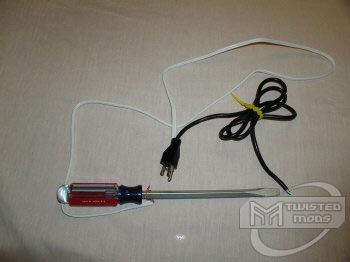 First, you will want to take the wire and strip both ends. Wrap the exposed wire around the metal part of the screwdriver and around the ground plug of the power cable. Make sure your connections are tight. You now have your discharging tool.