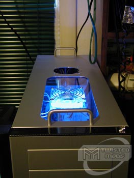 After cutting the hole in the top of the PC70, I installed the window with 3M double sided exterior mounting tape. I chose no to use the H-molding because I prefer the cleaner look of no molding. This tape has a 5lb hold (remember this fact). The window was very easy to install and adds a bit of flair to your top panel. I put an 80mm quad blue LED fan in the fan hole. The cuts on this window are very clean, and the 80mm fan looked very nice and reflected off the buffed fan hole. It was impossible to get a picture of this. The acrylic is very scratch resistant, which is a good feature if you?re like me and put a lot of CDs and such on top of your case.