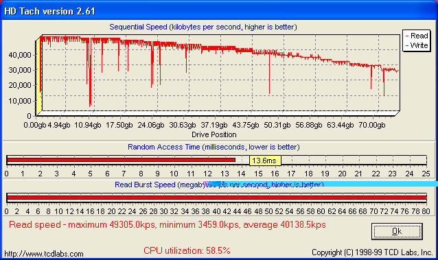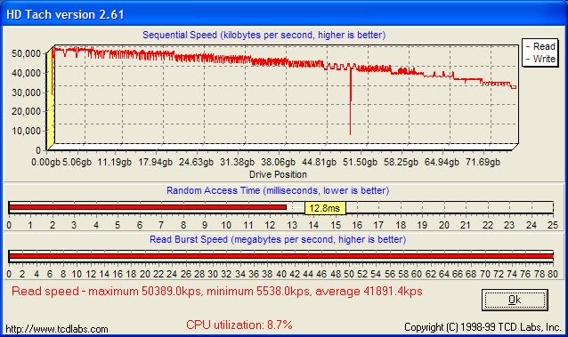 Let's talk for a moment about how the cache on a hard drive is actually used. When a read request is received, the drive checks the cache to see if the data is there, and if so, returns it directly from the cache. This results in a response time of microseconds, instead of the milliseconds it takes to seek the heads and wait for the disk to spin. If the data is not present in the cache, then the drive seeks to it, and reads it into the cache, and returns the information to the system. Since most reads are sequential in nature (once you read byte 44, then you want byte 45, etc.) the drive continues to ?read ahead? to cache the next data. When it is requested by the system, it is already in the cache, and can be returned quickly. The cache is many times faster than the milliseconds required for the drive head to move and read the data every time it is requested. A larger cache allows more space for temporary storage, reducing the number of times that the drive needs to seek, providing higher throughput, and speed is what this drive is all about! The Maxtor drive was compared to a similar drive from Western Digital. You can see the test beds in both tests as well as the results gathered from two hard drive benchmark programs available on the web. Both HDTach and FutureMark's PCMark are great for testing system performance focusing on the hard drive. We selected these because both have trustworthy reputations and provide unbiased test results. PCMark by FutureMark tests hard drive speed by transferring fairly large blocks of information, larger than the 8MB cache. This helps to eliminate results that would test memory speeds instead of drive speeds. For these benchmarks we used PCMark2002. ?HDTach's sequential read test is a little bit different from other benchmarks.? (From the HDTach website.) ?Most benchmarks create a file on the hard drive and test within that file...HDTach reads from areas all over the hard drive and reports an average speed. It also logs the read speeds to a text file that you can load into a spreadsheet and graph to visually read the results of the test.? For this review, we used the current version, HDTach 2.61. Test System #1 Specs: -Windows XP Professional Corporate Edition w/ SP1 -AMD Athlon XP 2200+ Processor -512MB Micron PC2100 RAM -Gigabyte GA-7VAXP Ultra Motherboard -GeForce 4 Ti4800 SE 128MB Gainward Video Card -Maxtor DiamondMax Plus 9 80GB ATA/133 HDD w/ 8MB Cache @ 7200RPM Test System #2 Specs: -Windows XP Professional Edition w/ SP1 -AMD Athlon XP 2200+ Processor -512MB Micron PC2100 RAM -Gigabyte GA-7VRP Rev. 2 Motherboard -GeForce 3 Ti200 64MB VisionTek Video Card -Western Digital 80GB ATA/133 HDD w/ 8MB Cache @ 7200 RPM ![]() ![]() These are the results obtained from running PCMark. The Maxtor drive (right), as you can see, beats the Western Digital drive (left) by 88 points. This shows that the Maxtor Drive is indeed faster than the Western Digital 80gb drive. This score however doesn?t show true performance which is why we used HDTach (below) to obtain accurate read speeds as well as random access times. ![]() ![]() Maxtor (bottom) also beat Western Digital (top) in this test. Both the random access times and the read speed are better on the Maxtor drive. Lower access times are better, as that is the time it takes the drive to locate the data it is trying to load. The Maxtor HDD had great results in this benchmark and I was really surprised. Keep in mind that during testing, no other programs were running on either system, and both systems had been freshly restarted as well, eliminating the possibility of a program interrupting test results. The benchmark results were what I expected. Both read speeds were around average for an ATA/133 drive; however, we found the CPU Utilization to be incredibly high on the Western Digital drive when compared to the Maxtor. The Maxtor drive performed very well in all benchmarks and outperformed the Western Digital comparison drive. Not only were access times lower but read speeds were higher; resulting in a faster overall drive. **Editors Note: We changed the sentence regarding CPU Utilization on July 7, 2003 due to concerns found in emails...CPU Utilization on the Western Digital Hard drive was "abnormal" when compared to that of the Maxtor. < Previous Page 2/4 || Next Page 4/4 > |