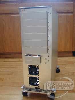 On the bottom of the case, you can see a closer picture of the front fan filter held in place with two thumbscrews. While this is a great idea, and adds a clean look to the front without ventilation holes, a constant cleaning on this front filter is absolutely necessary to maintain good intake airflow. Located also on the bottom panel of this case is a series of ?slits? for another fan on the inside of the case as intake as well. The casters raising the case off the ground play a HUGE part in this case?s cooling capability. If the case was placed directly on a surface such as carpet, there would be virtually no airflow because both the front and rear intake holes would be blocked, leaving no way for air to enter the case. Intake would be impossible on this case without casters, plus the convenience of rolling around an aluminum case filled with thousands of dollars worth the components is indescribable.