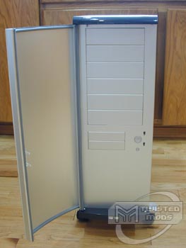 Moving around to the side, there really isn?t much to see, as a lot of the goodies are hidden inside the case. From this shot, you can see that the side panel is just a plain ol? piece of brushed aluminum. This chassis has no handle indentations, pre-cut windows, or anything else like that. This is nice, since it leaves PLENTY of space for you, the modder, to create any design you see fit. Each of the side panels is fastened by three chrome-like thumbscrews, with the option of a padlock for those who wish to keep their hardware from being stolen. To remove a side panel, simply unscrew the three thumbscrews and slide it towards the rear of the case ? then pull it upward and it will come free. There?s nothing special about the top panel of the PC-73SL either, it?s a natural brushed aluminum, just like the rest of the case, with no blowholes, indentations, or other markings. To remove the top panel, you would need to drill out the rivets holding it in place, which is not recommended (there?s a reason they put rivets in there) and the top would lift straight off. This picture also shows you the actual depth of the case. From the rear of the case to the front swinging door, this case is exactly 24? (two feet) deep. This case is probably perfect for fitting under any desk you may use without sticking out and getting kicked (which is always wonderful) if you don?t plan on putting it in some sort of server room. Who would want to hide this case though? As beautiful as it is, I?d use it for my home PC and put it on top of my desk. :)