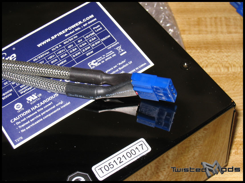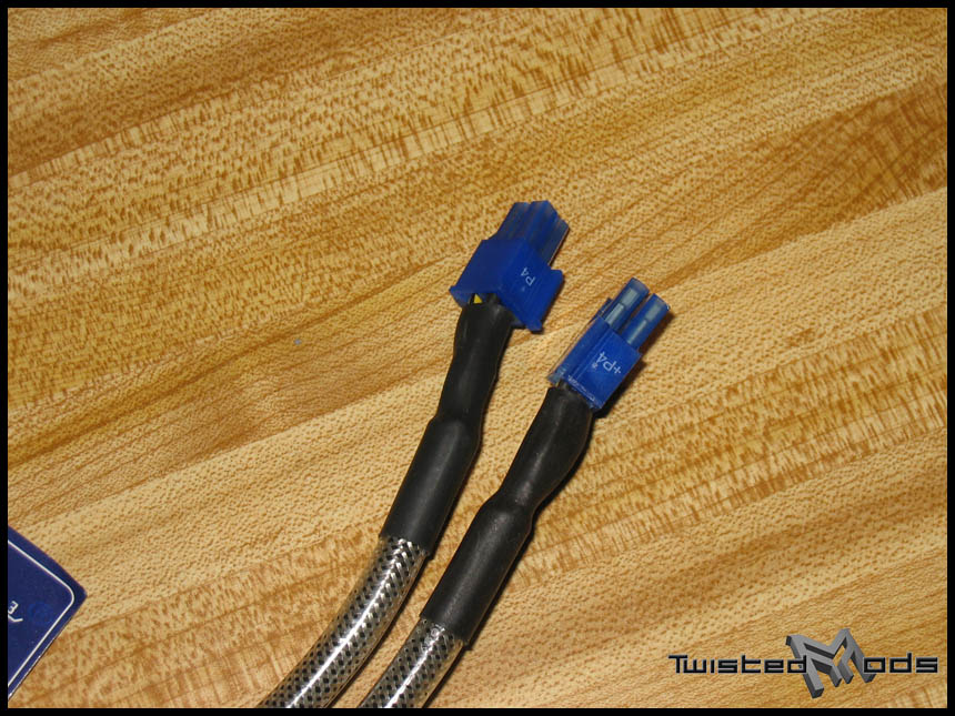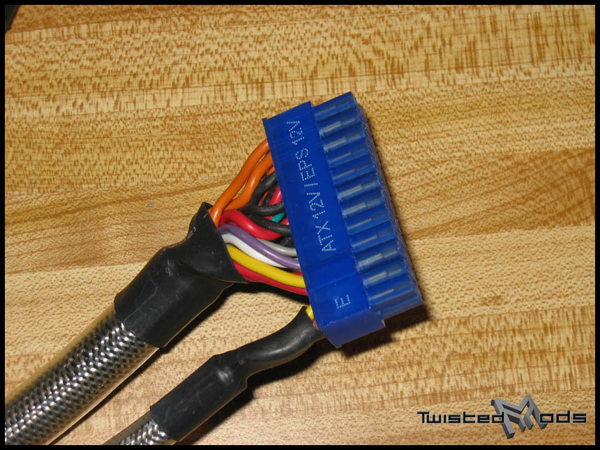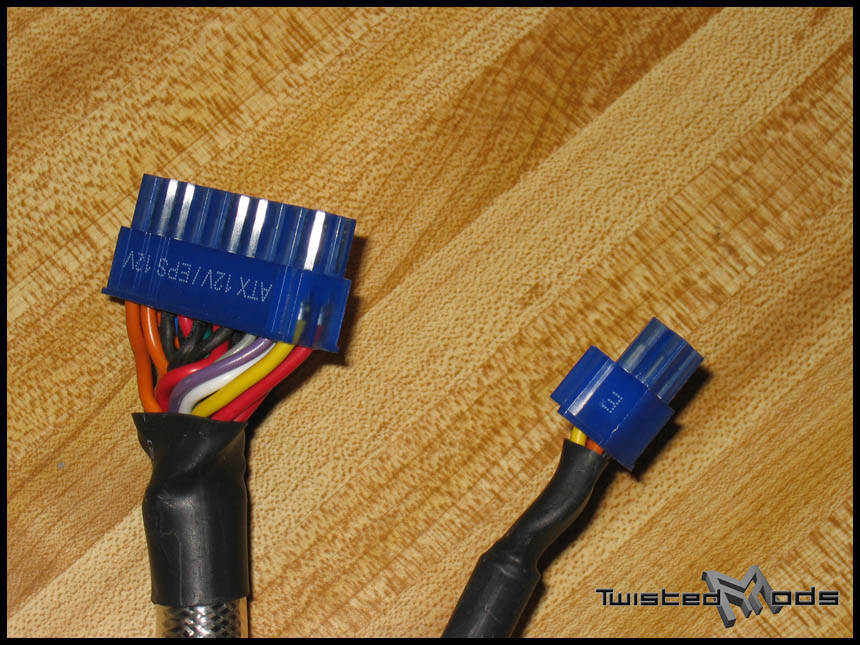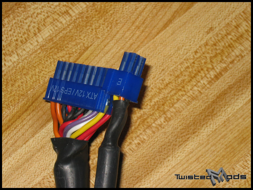 Moving on to the non modular cables on the power supply, we have the 20+4 pin ATX cable, and the 4+4 pin P4/Xeon connector. What's with the plus signs? Well, that means that the connectors are universal. As you can see in the picture, the connectors have groves in them that allow the ends to slide onto each other, or in this case, slide off. This allows you to configure the connectors for whatever you need, and hide the rest. A very clever solution to creating a universal power supply.