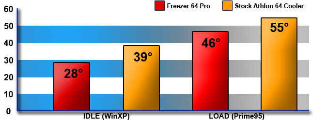I tested this 64 Freezer Pro with MX-1 thermal paste by recording the temperatures of my CPU under Idle and Load. I'll also be comparing it with the stock AMD 3800+ Heatsink box, with Arctic Silver 5 thermal paste. Idle - After installing the 64 Freezer Pro using the MX-1 thermal paste, I let the system run for 3 straight days, like I mentioned before, the paste has to settle. On day 3 is when I started the testing, first I let the system run Idle for about 5 hours with the fan at max RPM. The results are far better than what I expected. It's lowest temperature was 28°F in a 75°F environment. It out performed the AMD heatsink by 11°C which is a lot, considering this is Celsius we're talking about. Load - After finally testing the system in Idle, I decided to test the beast and see what it was capable of, and yet again it has exceeded my expectation. I ran Prime95 for 5 hour, the results were astonishing. The temperature maxed out at 46°C, and went nowhere above that, while the stock AMD heatsink hit 55°C. Yet again it out performed the AMD heatsink, but this time by only 9°C. Result: After putting the AC Freezer 64 Pro through such stressful conditions, it is obvious that it just won't give in. Even having it under full load, its still one of the quietest heatsinks on the market. Results In a Graph Format: |